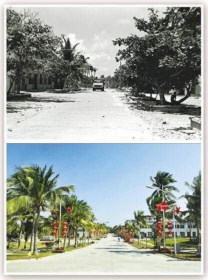 拼版照片為西沙永興島北京路今昔對比(上圖為1991年5月新華社記者姜恩宇攝,下圖為2016年2月5日新華社記者楊冠宇攝)。 新華社發