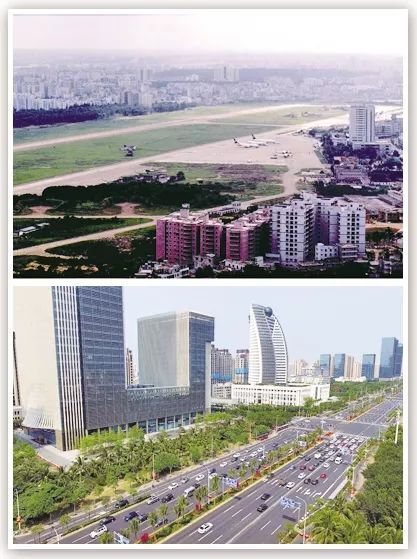 拼版照片為海口市國興大道,曾經是海口大英山機場(上圖為1999年5月新華社記者姜恩宇攝,下圖為2018年4月14日新華社記者郭程攝)。 新華社發