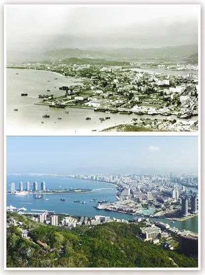 拼版照片為在三亞市鹿回頭景區鳥瞰三亞市景今昔對比(上圖為1991年2月新華社記者姜恩宇攝,下圖為2018年4月4日新華社記者郭程攝)。 新華社發