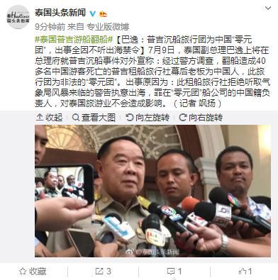 [環球網快訊 記者 趙衍龍]泰國頭條新聞7月9日消息,泰國副總理巴逸上將在總理府就普吉沉船事件對外宣稱:經過警方調查,翻船造成40多名中國游客死亡的普吉租船旅行社幕后老板為中國人,此旅行團為非法的“零元團”。