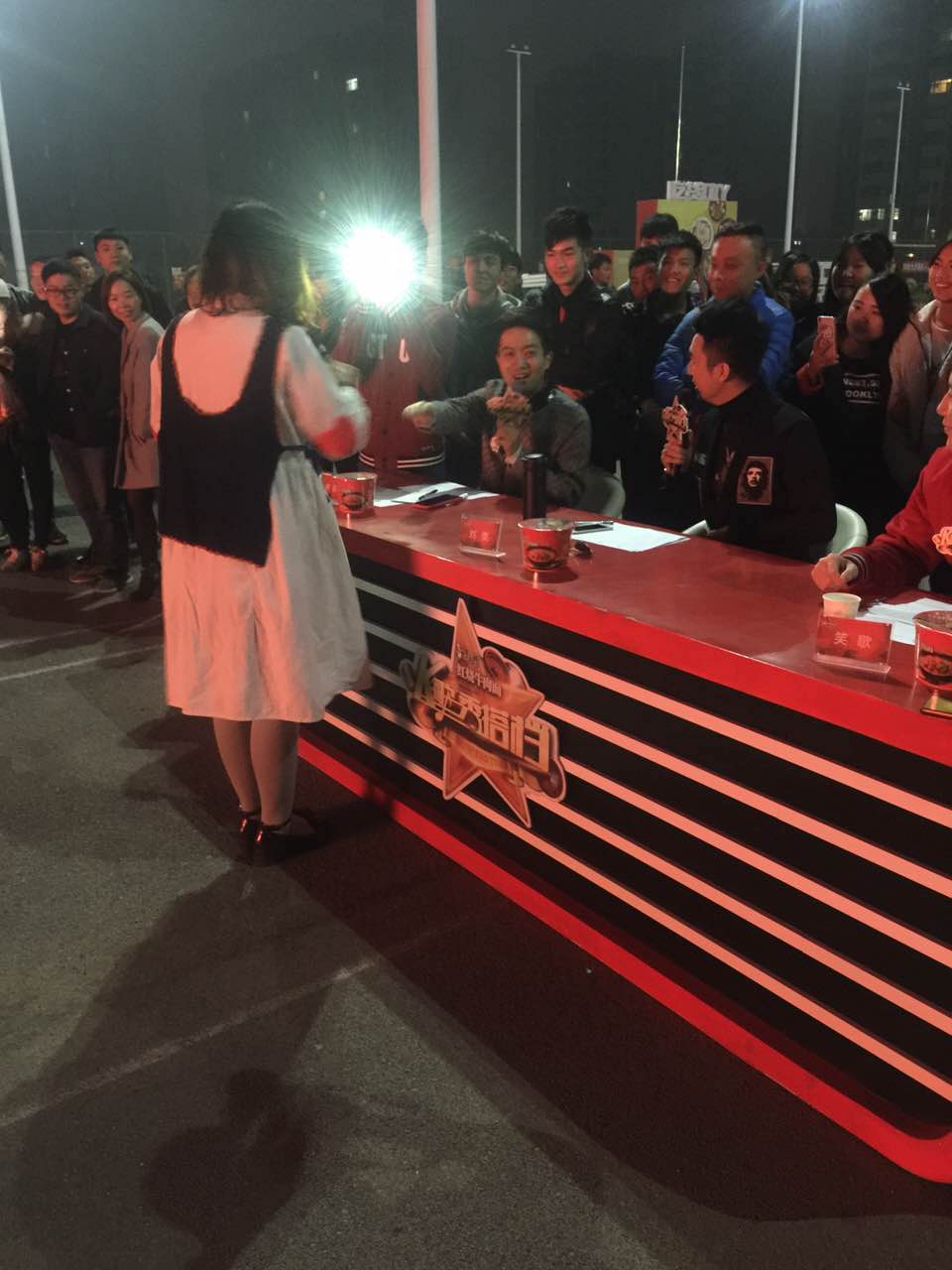 整場海選持續到天黑,非常有趣的是,可能是大家剛開始都持觀望態度,臨近天黑的時候,真正的好聲音才開始登上舞臺,比賽的十強幾乎都產生在最后上場的十位選手中,評委現場不僅在盲選,而且在不斷的更新五強的名單,以至于,最后覺得只選五強臺可惜了,在和導演組商議之后,晉級名額直接增加到了十個。他們將和前五場康師傅紅燒牛肉面《名嘴K歌秀》校園海選選拔出來的選手一起,參加《名嘴K歌秀》第三季,獲得和名嘴演唱的機會。