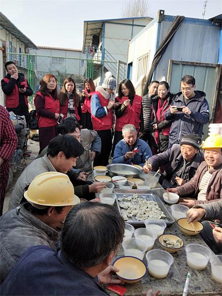 另一邊,在鄭州市花園路廣電南路交叉口,主持人劉雯和韓佳帶著十幾名義工早早的在路邊就開始忙活了。他們要給附近50多名環衛工人煮餃子。平時,環衛工們的午飯都很簡單,甚至都是隨便對付的,這次,主持人和義工們特意選在離工人們中午休息比較近的地方,搭起了臨時的灶臺,給工人們做上一頓熱騰騰的餃子。由于條件簡陋,臨時灶臺上的火十分不穩定,劉雯和韓佳脫下厚重的外套,擼起袖子親自生火,費了好大勁終于把餃子下鍋了。吃上熱騰騰的餃子,環衛工人們特別開心。一位老大爺由衷的感嘆道:“好久沒吃過這么暖心的午飯了,謝謝你們。”