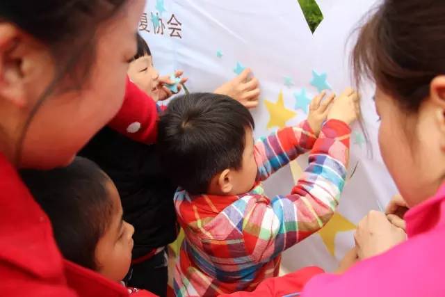 志愿者代表和星兒代表把制作好的小星星粘貼到我們的星星兒童村發展藍圖上。
