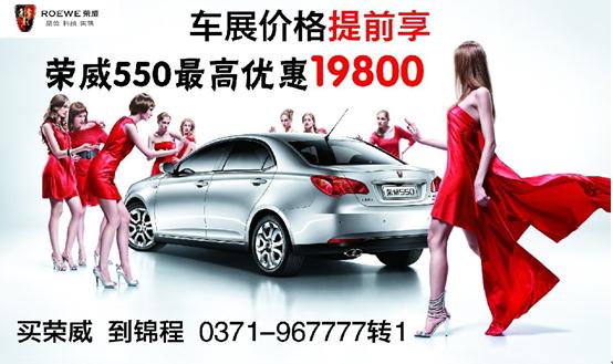 近日,編者從河南錦程榮威了解到,榮威車展價格提前享,榮威550最高直降1.98萬元。購榮威車的朋友們不用再擠車展,在優雅的環境中提前享受有車生活,河南錦程榮威為廣大車友朋友們提供最實惠最保障的購車政策。買榮威汽車,到河南錦程看看再決定,搶購熱線:0371—967777轉1.