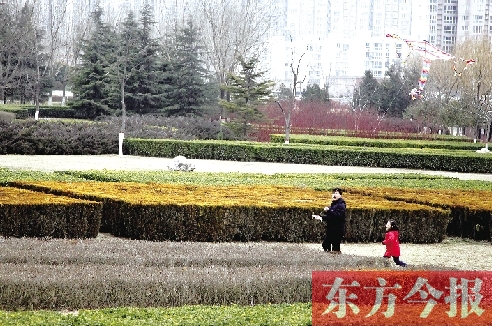 18日,鄭州市航海廣場上一位父親帶著孩子在放風箏,孩子歡快的笑聲不時響起(如圖)。
