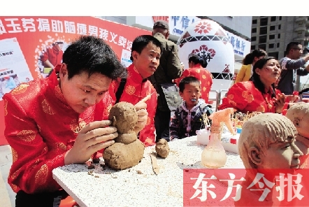 4月13日,在鄭州市秦嶺路一廣場,幾位民間藝人發起為腦癱患兒小晨陽募捐的義賣活動,造型各異的面人、神氣活現的泥塑、精致逼真的葫蘆烙畫……這些久違的民間藝術品受到市民熱捧,一個小時募捐了3667元。
