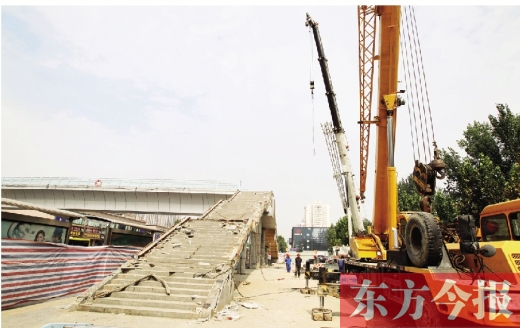 張培玉介紹,拆除人行天橋沒有占用公交站臺的空間,在此期間,公交車可以照常停靠,只有在9月28日晚間拆除天橋主體時,暫時封閉該段道路,待拆除完畢,仍可照常通行。