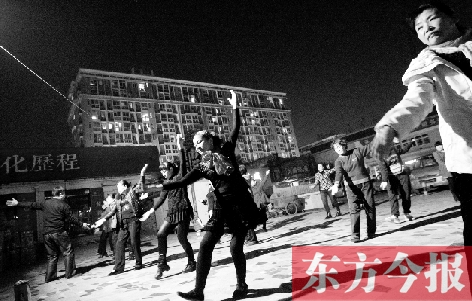 一塊百十平方米的小場地,距離居民樓不到10米。一盞探照燈,一個可滑動的大音響,伴隨著歌曲,三三兩兩的人就火熱開跳了。不遠處,陸續還有人來。甩開外套,加入隊伍中。