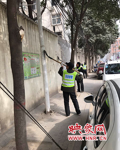 工作人員把丟在地上的廣告紙,拾起扔進準備好的垃圾袋;欄桿墻面上“頑固的小廣告”,先灑上水潤濕,然后用小鏟逐一耐心鏟掉;對路面的灰塵、生活垃圾建筑垃圾等進行現場打掃,集中清運;對散亂的纜線進行整理固定,對裸露的黃土覆蓋上防塵網,工作場面甚是壯觀。經過3個小時的辛苦勞動,共清理垃圾5余車。