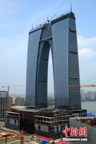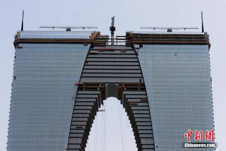 9月2日,位于江蘇蘇州工業園區的東方之門幕墻安裝進入收尾階段,頂部幕墻正在施工中,幕墻穹頂即將封閉。