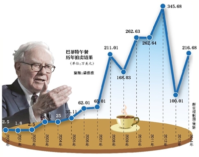 過去的這15次拍賣共籌集了約1780萬美元。最低中標(biāo)價(jià)格為2001年的1.8萬美元,最高為2012年的346萬美元,至今記錄仍未被打破。去年的巴菲特午餐是由新加坡的Andy Chua出價(jià)216.68萬美元競得。