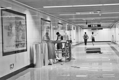 進(jìn)站通道,工人師傅正做收尾施工。