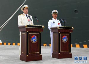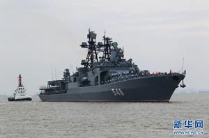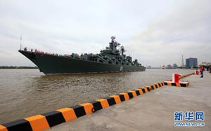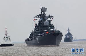 當日,參加中俄“海上聯合—2014”軍事演習的俄方艦艇陸續駛抵上海某軍港。中俄兩國海軍互鳴禮炮,中方為來訪的俄艦舉行隆重歡迎儀式。俄羅斯太平洋艦隊旗艦“瓦良格”號導彈巡洋艦駛入軍港時,參加歡迎儀式的軍樂隊奏響歡迎曲。隨后,“快速”號驅逐艦、“潘捷列耶夫海軍上將”號大型反潛艦、“伊利姆”號中型海洋油船、“涅維爾斯科伊海軍上將”號大型登陸艦,“卡拉爾”號海洋拖船陸續駛入港口。這次聯合軍事演習,中俄海軍都派出了主戰艦艇參加。中方參演兵力包括導彈驅逐艦、導彈護衛艦、綜合補給艦以及導彈艇等水面艦艇8艘、潛艇2艘、固定翼飛機9架。俄方參演兵力包括巡洋艦、反潛艦、驅逐艦、登陸艦、油船和海洋拖船等水面艦艇6艘。此外,為執行海上聯合解救被劫持船只、護航等特殊任務,雙方還派出艦載直升機、特戰分隊等兵力參加此次演習。新華社記者 查春明攝