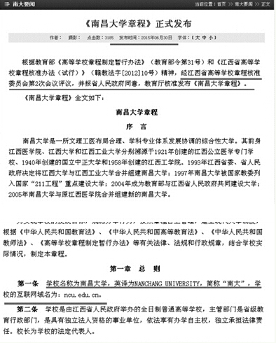 據了解,近日南昌大學在官方主頁南昌大學新聞網正式發布了《南昌大學章程》。記者看到,該章程系根據教育部《高等學校章程制定暫行辦法》和《江西省高等學校章程核準辦法(試行)》精神,經江西省高等學校章程核準委員會第2次會議評議,并報省人民政府同意,教育廳核準發布。