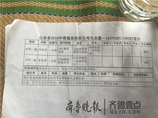 陜西師范大學在山東招收6名體育教育專業的學生,均為免費師范生。第一志愿的錄取線為文化課362分,專業課66.54分。學校按照專業課成績由高到低擇優錄取。常升的文化課考了403分,專業課考了93.64分,遠超出學校的錄取線。而魯東大學官網顯示,該校社會體育指導與管理專業的文化課最低錄取分數為407分,而常升的文化課成績差4分。不過,該校對專業課要求低,專業課成績最高分僅為77.65分。