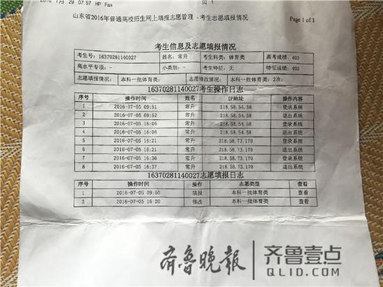 后來,他們從青島市招生辦網上填報志愿系統了解到,7月5日上午10點左右報完志愿后,下午4點20分,常升的志愿被修改,一志愿被改為了魯東大學社會體育指導與管理專業。