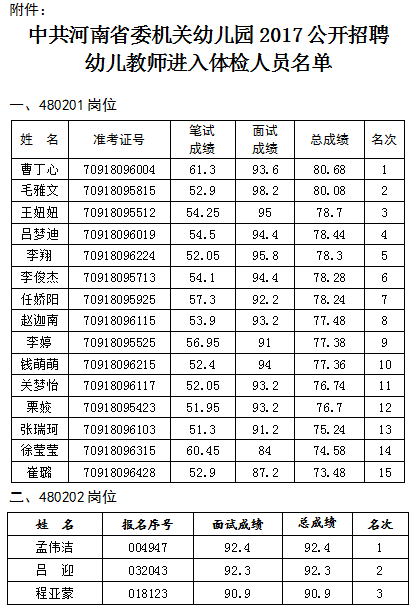 中共河南省委機關幼兒園2017年公開招聘幼兒教師面試工作已經結束。根據總成績排名,按照招聘人數與體檢人數1:1的比例,確定480201崗位15名考生進入體檢環節,480202崗位3名考生進入體檢環節。