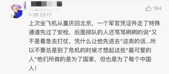 有網友就指出,在機場安檢口,一位軍人憑證件走軍人優先窗口,卻有乘客罵罵咧咧地說:“又不是著急去打仗,憑什么讓他先進去?”
