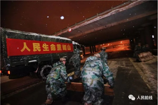 1月25日晚開始,東部戰區和江蘇省軍區緊急派出官兵,奔赴駐地掃雪除冰、清理道路,保障人民出行安全。