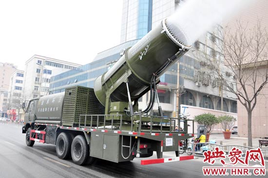 映象網訊(記者 王濤 通訊員 司佳 文/圖)“向著霧霾開炮……向著揚塵開炮……”12月26日上午,鄭州市經三路街頭出現了一輛形似炮筒的“大家伙”,吸引了來往車輛及行人的目光。