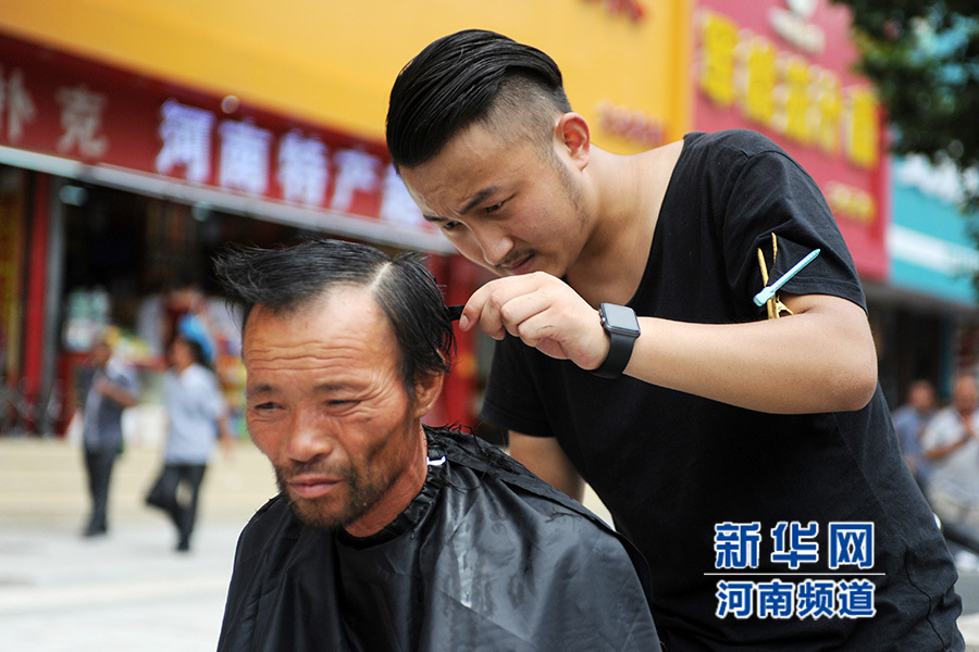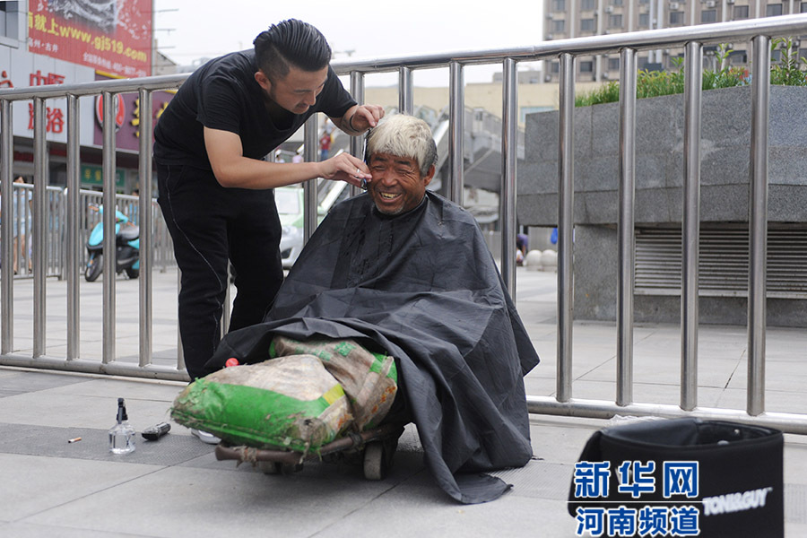 從7月21日開始,一位名叫紅濤的理發師每逢周二在鄭州街頭免費為流浪人員理發,他希望用此項行動呼吁大家關注街頭流浪人員群體。紅濤說,他還打算免費為農民工等群體理發,讓他們感受到社會的溫暖。新華社發(馮大鵬 攝)