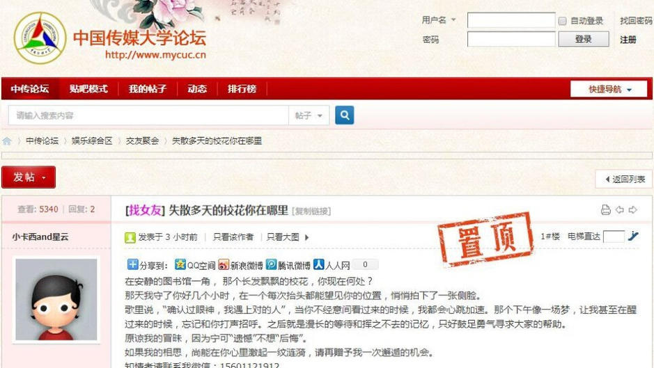 正值開學(xué)季,中國傳媒大學(xué)驚現(xiàn)癡情男,張貼了數(shù)百張海報只為表白校花,據(jù)照片顯示,海報中有女孩側(cè)臉照片,還留下男生的聯(lián)絡(luò)方式,甚是精細(xì)。