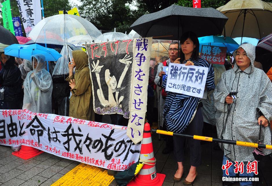 隨著安倍陣營強推以解禁集體自衛權為核心內容的安保法案最終過關的計劃進入“倒計時”,日本民眾的反安保抗議活動再度進入高潮。在之前徹夜抗議之后,9月17日白天,又有眾多日本民眾冒著大雨持續聚集在國會周邊進行抗議活動。中新社發 王健 攝