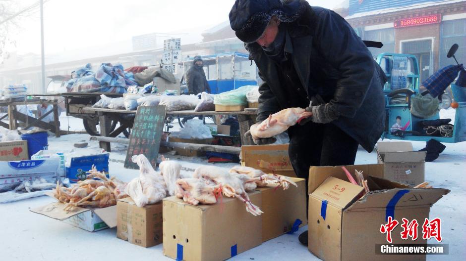 呼倫貝爾市圖里河鎮(zhèn)菜市場,當日圖里河鎮(zhèn)最低氣溫達-42℃。 圖片來源:視覺中國