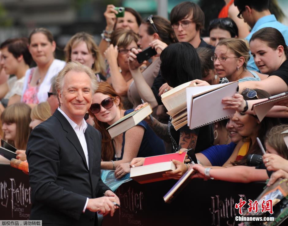 圖為2011年7月11日,電影《哈利·波特與死亡圣器2》在紐約林肯中心舉行首映式,阿倫·瑞克曼(Alan Rickman)現場為粉絲簽名。