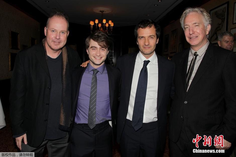 圖為2011年11月21日,電影《哈利·波特與死亡圣器2》導演大衛·耶茨(David Yates,左)、男主角丹尼爾·雷德克里夫(Daniel Radcliffe)等人與阿倫·瑞克曼(Alan Rickman,右)在紐約合影。