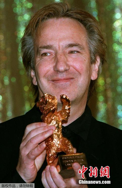 圖為1996年2月26日,英國男演員阿倫·瑞克曼(Alan Rickman)憑借《理智與情感》獲得第46屆柏林電影節金熊獎。