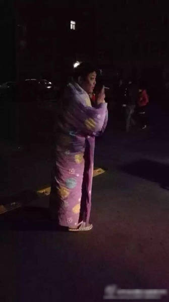 有網友反映,其時當地戶外溫度達零下十四度,許多市民出來避震時不得不罩著被子。圖為現場災民。