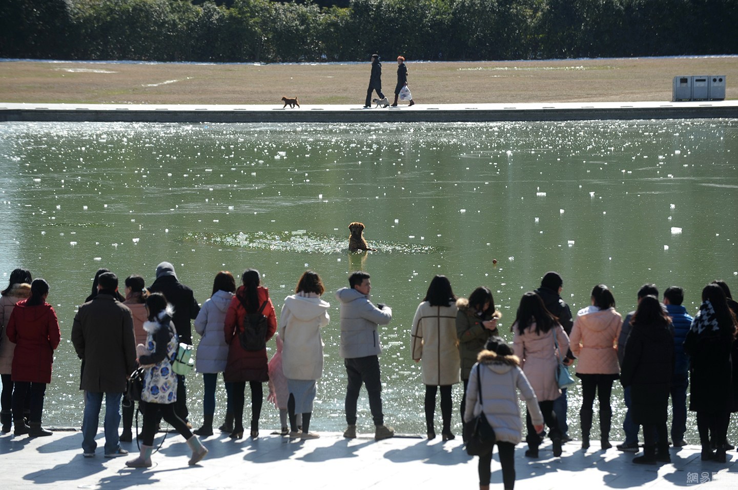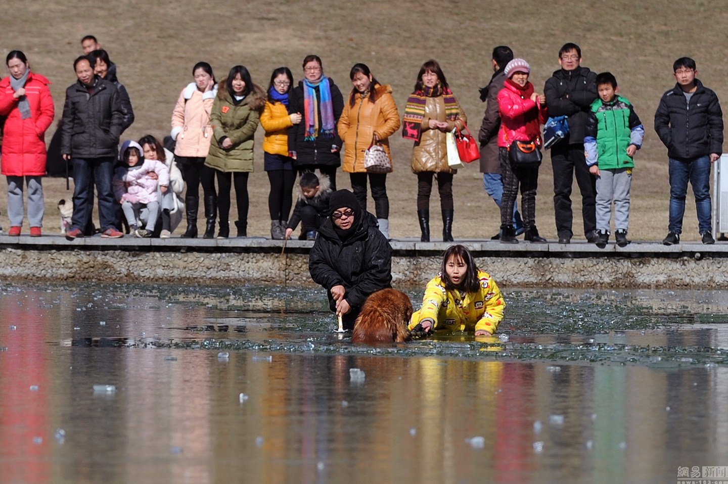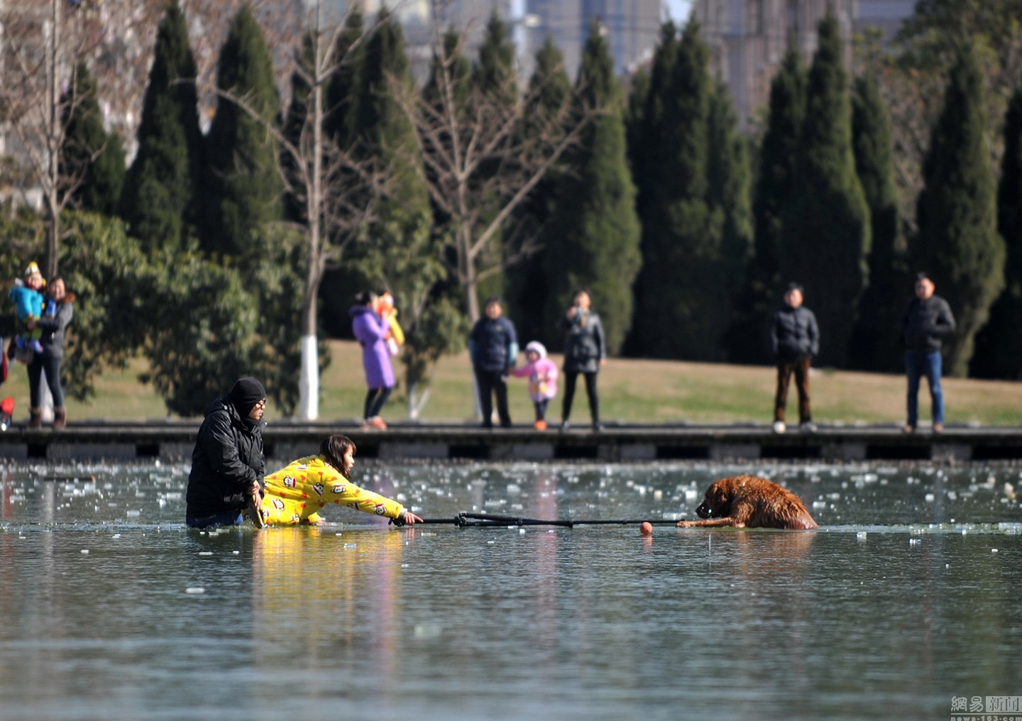 “我知道這水不深,自己又會游泳。”面對冰冷的水面,項(xiàng)先生并沒有多想,只想趕緊救出狗狗。圖為兩人合力救金毛現(xiàn)場。