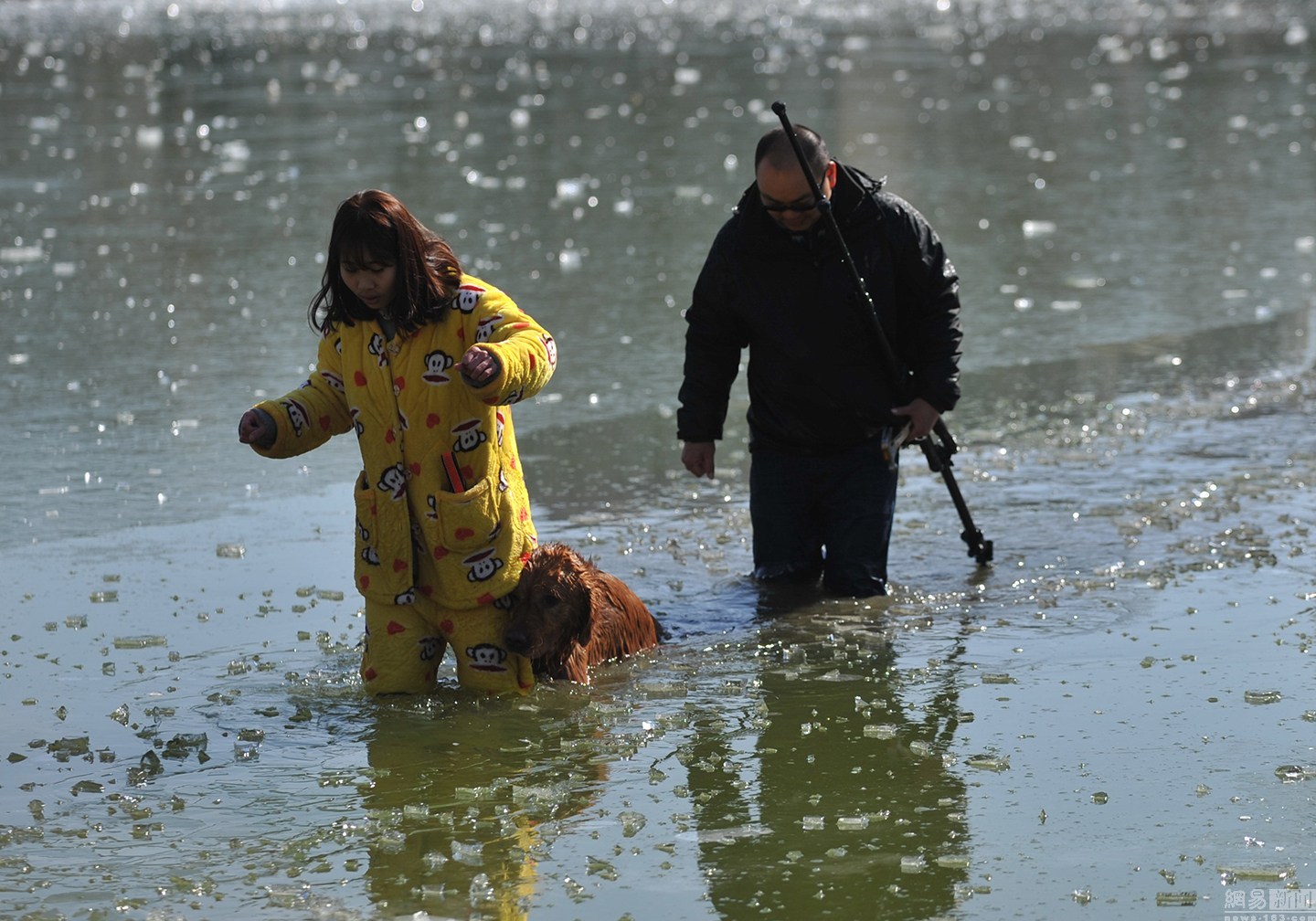 就這樣,水面由他的膝蓋深到其腰部。近十分鐘的時間,項(xiàng)先生為金毛打開了一條近30米長的冰道,落水的金毛獲救了。圖為主人和好心市民項(xiàng)先生一同走向金毛。