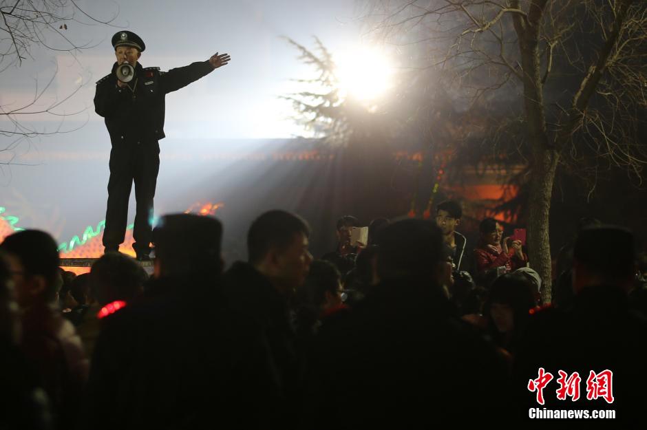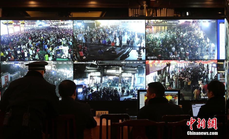 2月22日晚,南京警方在監控涌進夫子廟廣場上的人流。 中新社記者 泱波 攝