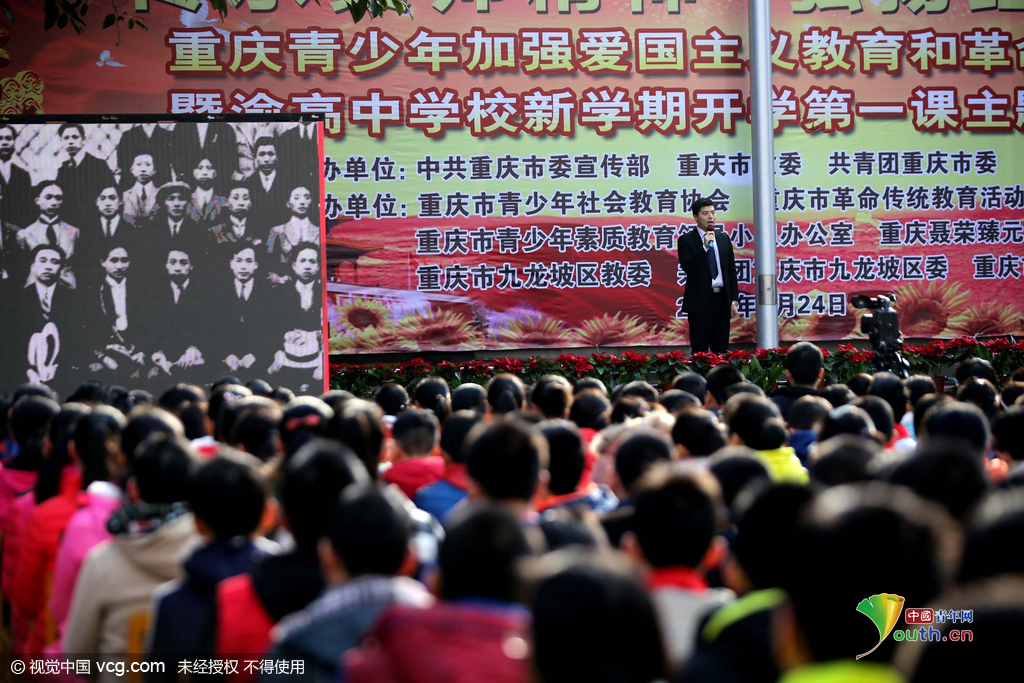 2016年02月24日,重慶市新區(qū),渝高中學(xué),開學(xué)典禮上同學(xué)們傳遞一面90米寬的巨大黨旗。開學(xué)第一課由聶榮臻元帥陳列館報(bào)告團(tuán)成員為同學(xué)們宣講老一輩無產(chǎn)階級(jí)革命家的豐功偉績(jī)。視覺中國(guó)