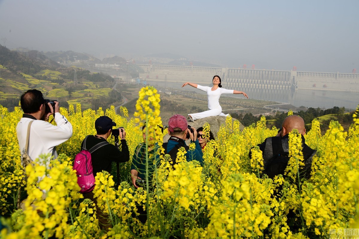 2016年3月6日,湖北宜昌,隨著春季氣溫的回升,湖北宜昌三峽壩區高家溪油菜花絢麗綻放,把三峽大壩映襯得分外壯觀美麗,吸引了眾多攝影發燒友和游人前來踏青采風游覽。當天一位練瑜伽的大媽陶醉于壩前花海,秀起了瑜伽,一時吸引了攝影發燒友和游人瘋狂拍攝。圖為大媽花海中秀瑜伽。