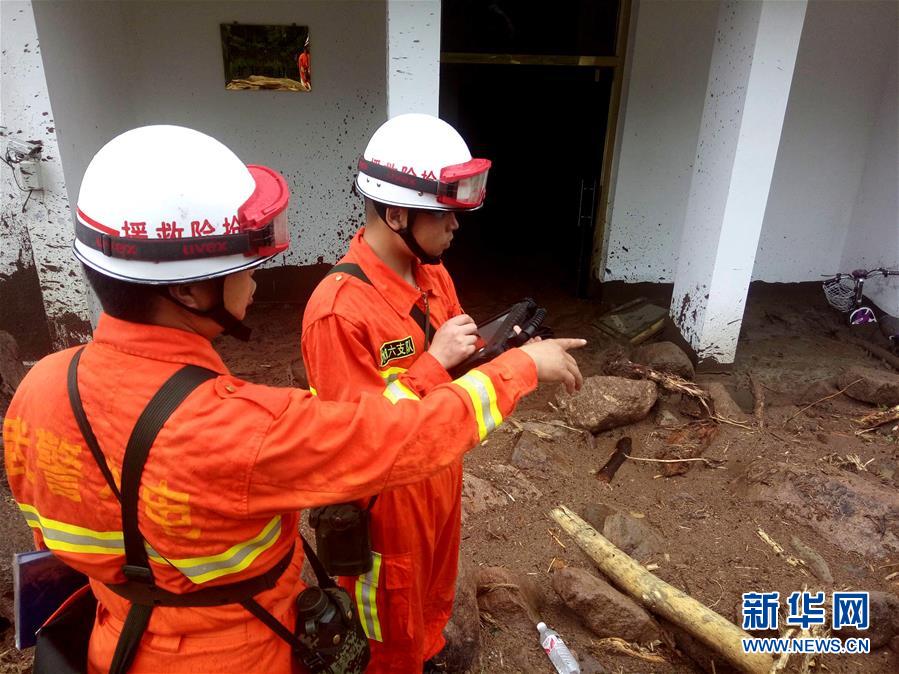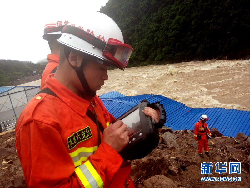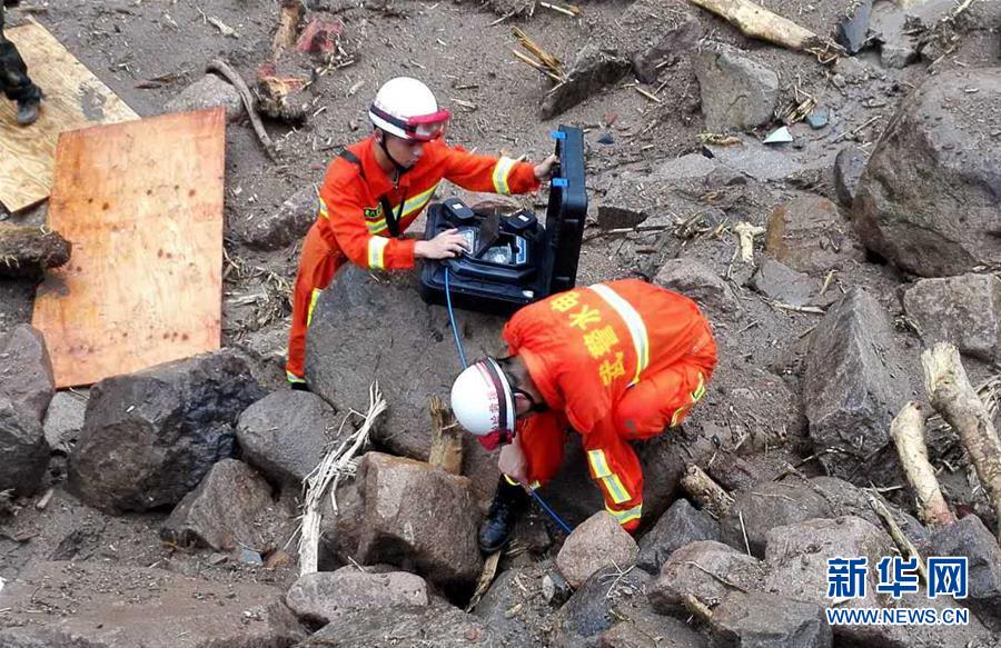 5月8日,在福建泰寧山體滑坡救援現場,武警水電二總隊六支隊官兵利用“雷達生命探測儀”對任務區進行搜救(手機拍攝)。