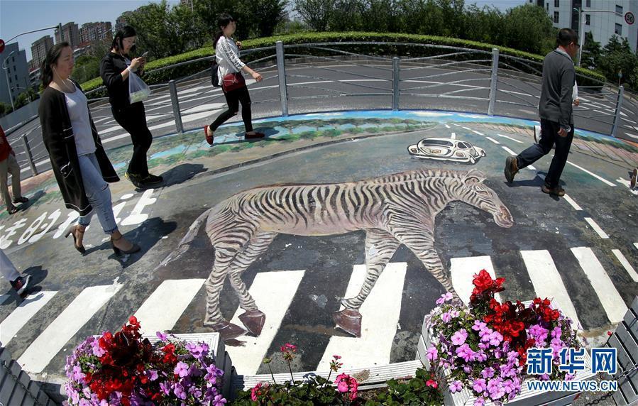 5月16日,行人從上海漕河涇開發區一處3D斑馬線上走過。近日,上海漕河涇開發區的一條人行橫道線變身一幅3D效果圖畫,還“植入”了宣傳行走禮讓的標語,呼吁文明出行。 新華社記者 凡軍 攝 圖片來源:新華網