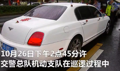 下午2點(diǎn)45分許,上海交警總隊(duì)機(jī)動(dòng)支隊(duì)巡邏時(shí),在周家嘴路近大連路處發(fā)現(xiàn)一路婚車車隊(duì),共計(jì)5輛車,其中領(lǐng)頭的是懸掛“滬BGM018”牌號的白色賓利歐陸跑車。后經(jīng)查實(shí),此車為套牌車。