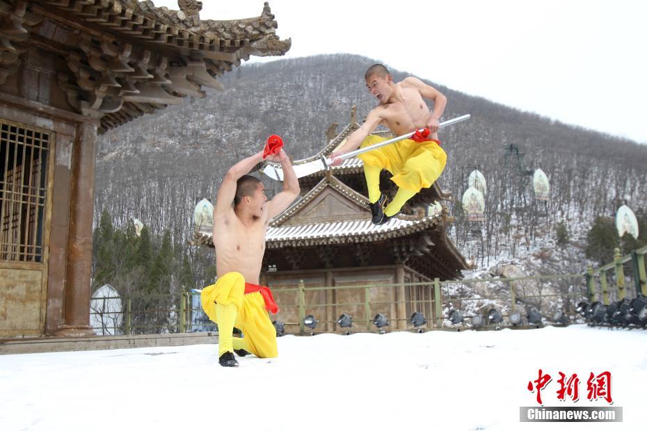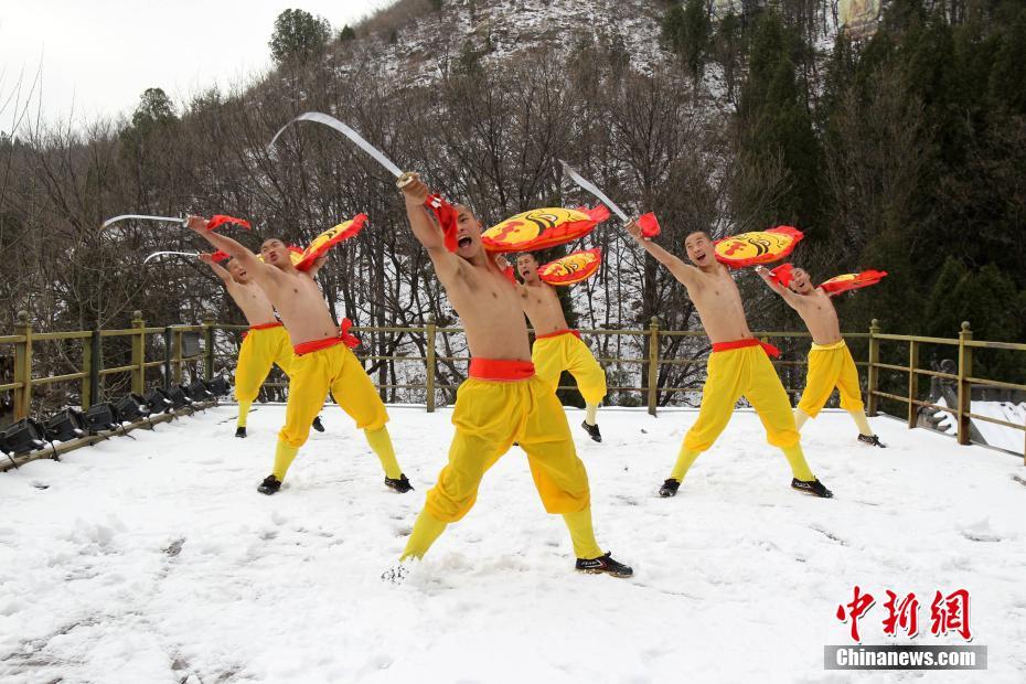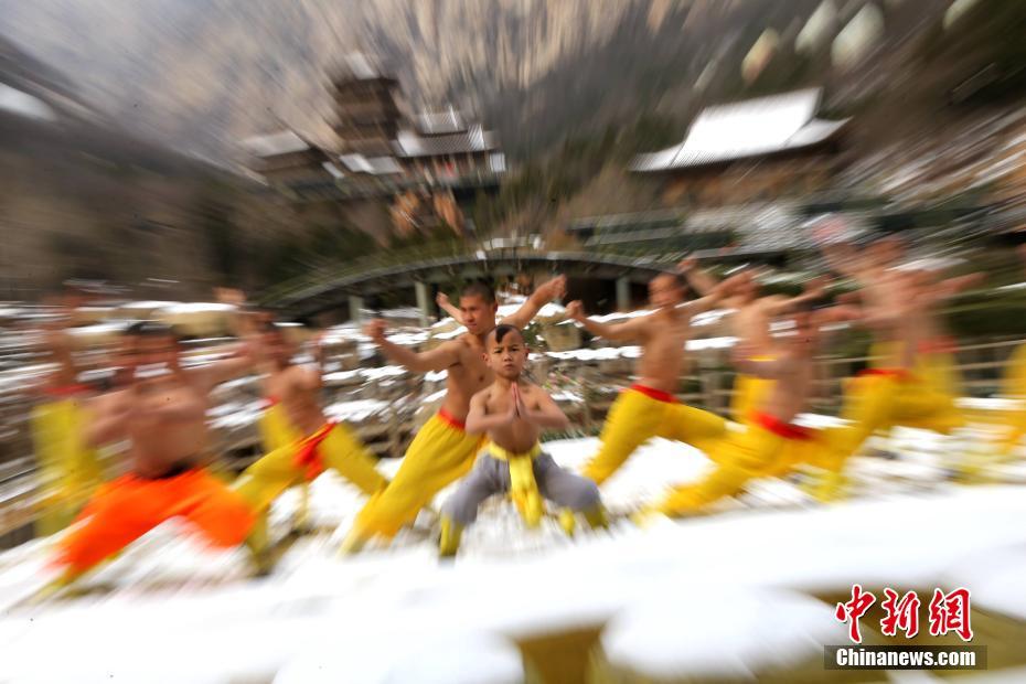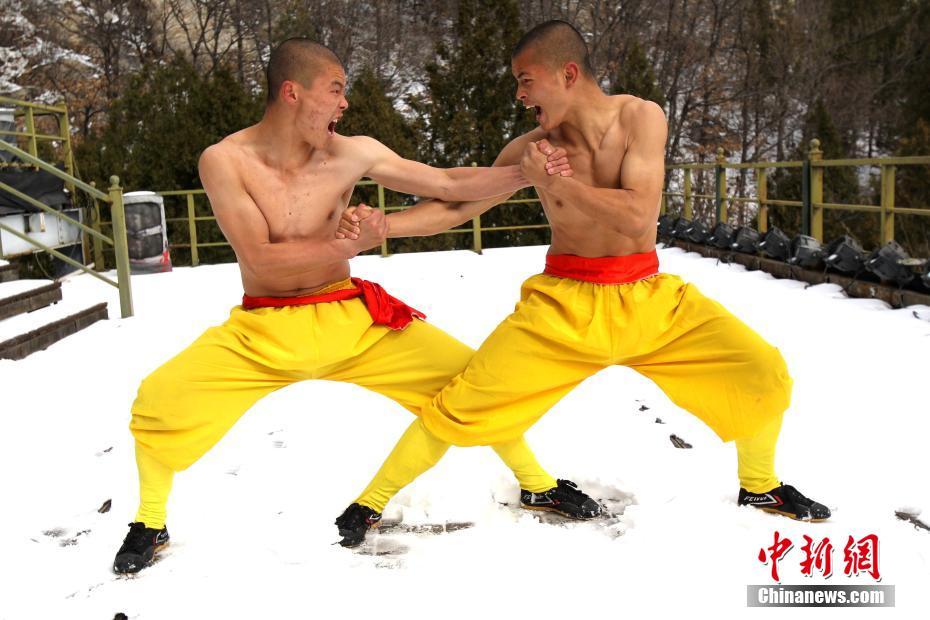 2月22日,河南出現暴雪天氣,氣溫驟降,少林寺所在地登封嵩山白雪茫茫,銀裝素裹,武僧們赤膊上身在冰天雪地里苦練少林功夫。盡管寒風刺骨,少林武僧們依舊照常練功,只見他們赤膊上陣,不懼寒冷,在雪窩里扎馬步、練少林棍、刀槍對戰。他們中間最小的只有6歲。 中新社記者 王中舉 攝