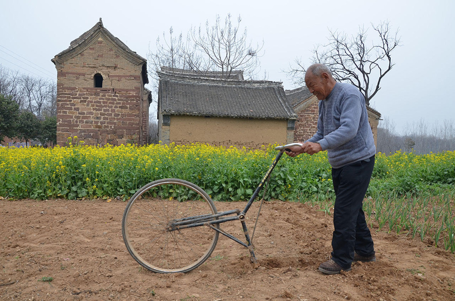 這種種菜的小地塊,推拖拉機過來翻有點兒擱不住,拿鋤頭鋤又有些費力,還好有這個神奇單車,連小孩子都能干活了。