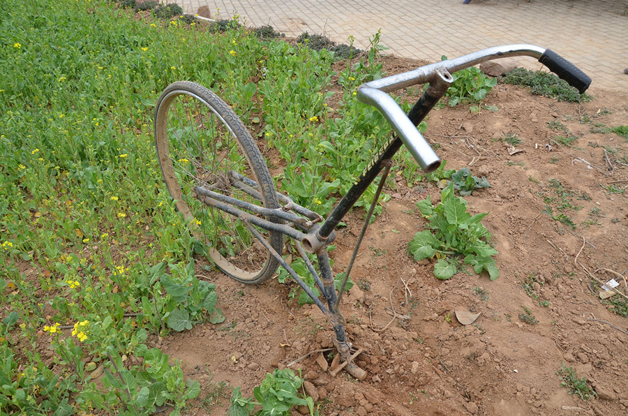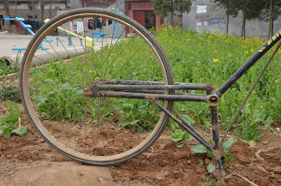它現在的作用是鋤的角色,多少還有點兒犁的意思,但前身是一輛二八型的大自行車,仔細觀察了一下,這個輪子應該是車子的后輪。