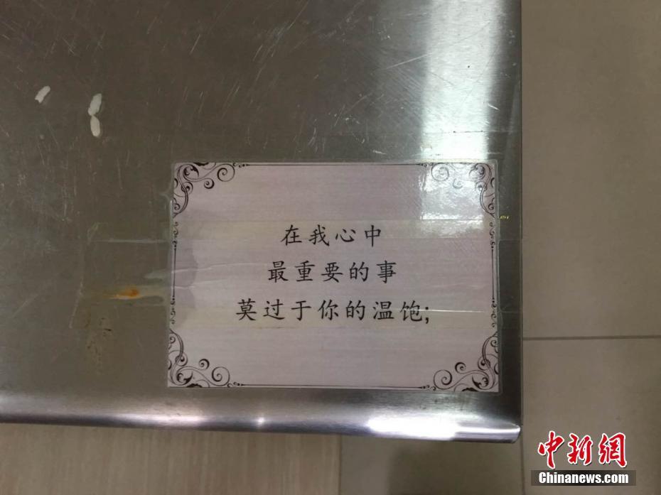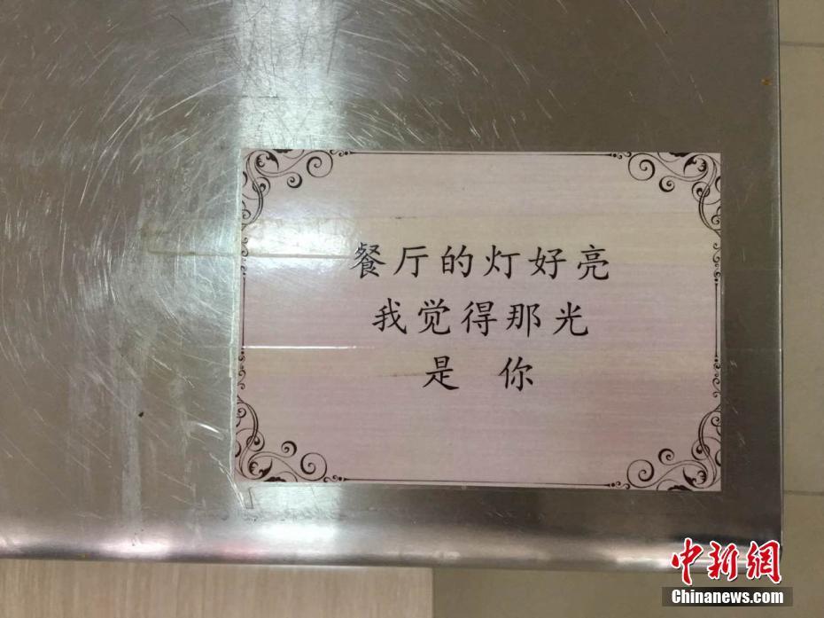 “這些情詩(shī)是開(kāi)學(xué)前貼上的,剛開(kāi)始只是想讓餐廳更個(gè)性化一點(diǎn)。”德寶朕說(shuō),很多人覺(jué)得食堂就是個(gè)做大鍋菜的地方,吃飽肚子就行?!拔蚁爰右稽c(diǎn)不一樣的元素,就發(fā)動(dòng)朋友收集和吃飯有關(guān)的三行情書(shū)?!毖辔?阿琳娜 攝影報(bào)道