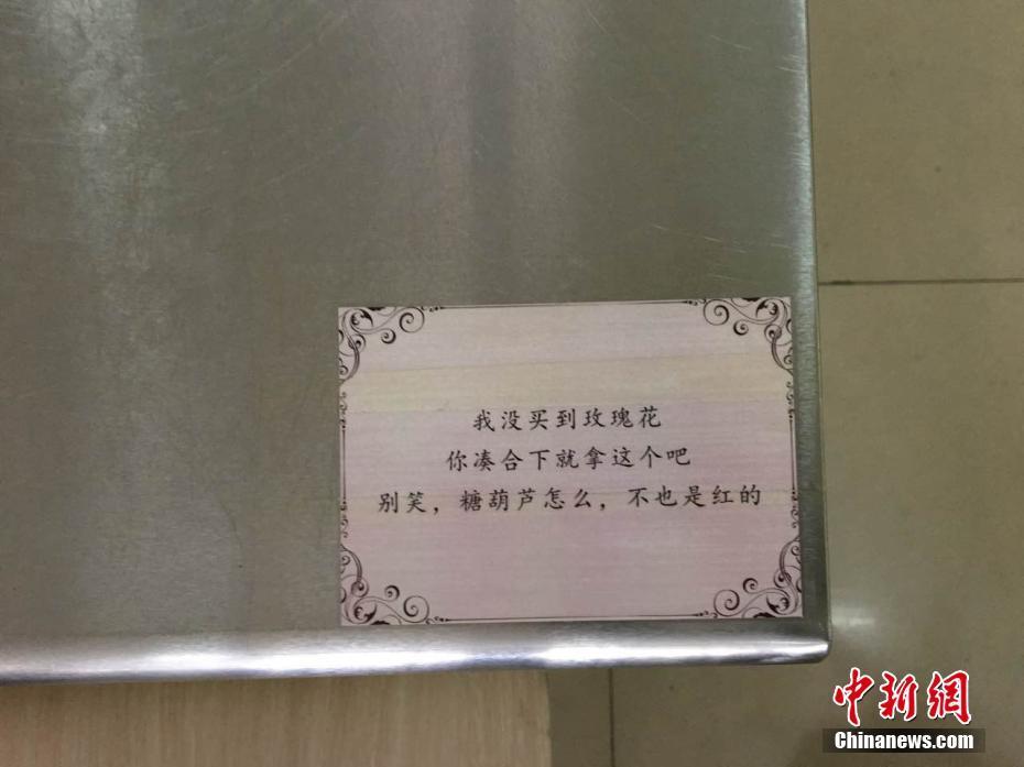 記者16日在西北政法大學(xué)雁塔校區(qū)綜合餐廳里看到,這些富有創(chuàng)意的三行情書(shū)貼于餐桌的右下角,語(yǔ)句詼諧幽默,浪漫十足,不時(shí)有買(mǎi)飯路過(guò)的學(xué)生駐足觀看,還有人拿出手機(jī)拍照。不少慕名而來(lái)的外校生專(zhuān)程前來(lái)蹭飯,體會(huì)“樸素的食堂愛(ài)情故事”。燕武 阿琳娜 攝影報(bào)道
