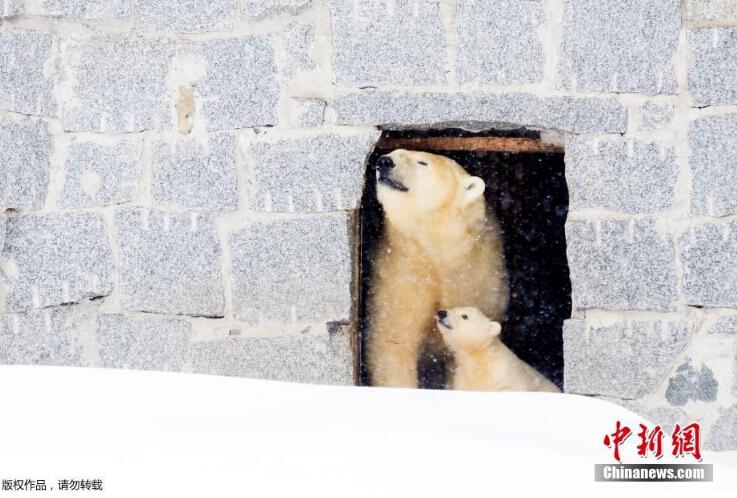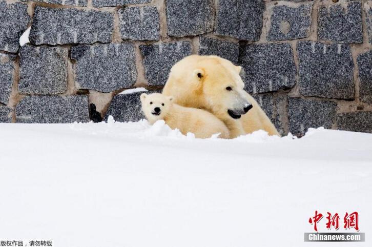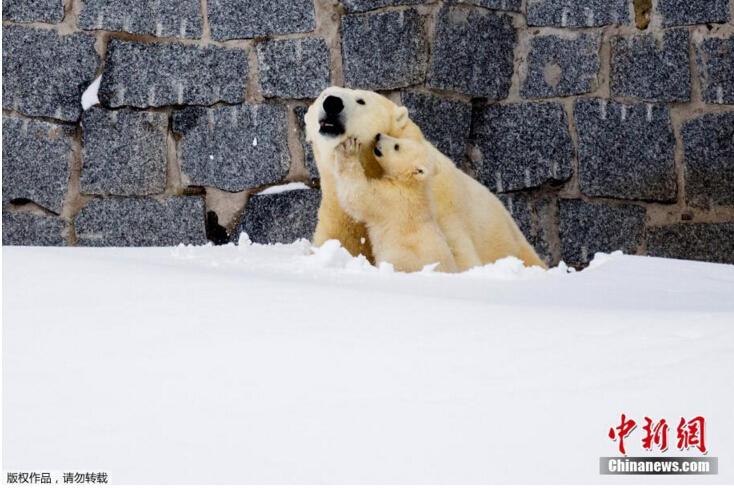 當地時間3月15日,芬蘭一野生動物園內,北極熊母親帶著她的幼崽第一次在戶外亮相。小北極熊第一次在雪中玩耍,跟母親“求抱抱”。