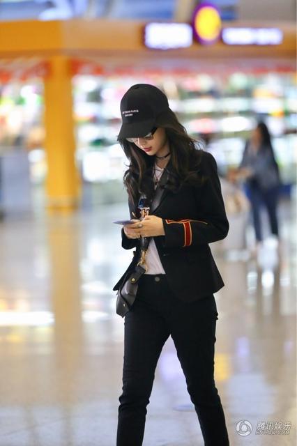 騰訊娛樂訊 23日下午,Angelababy現身上海機場,一身紅黑拼色西裝讓Baby看起來十分帥氣有型。