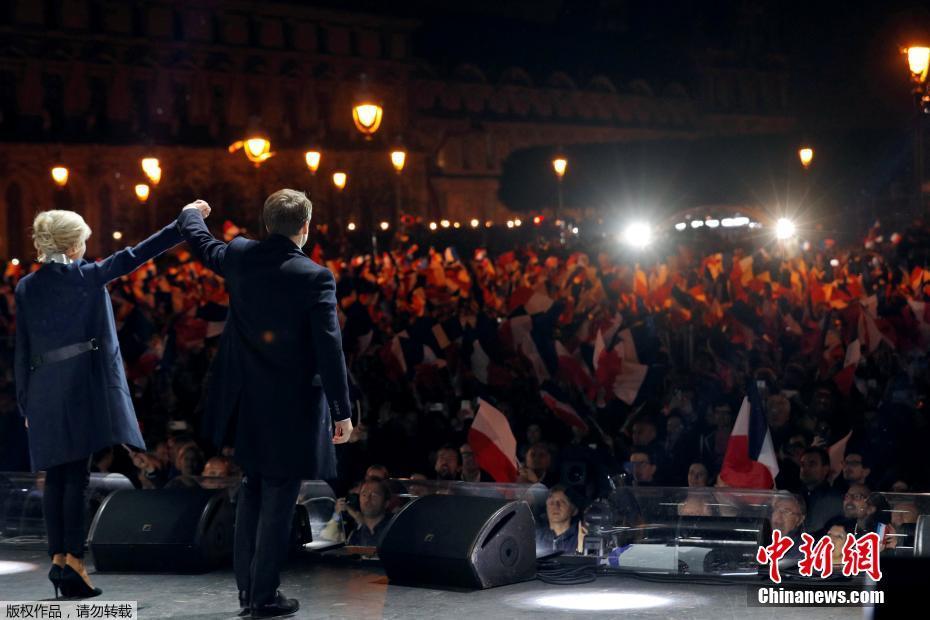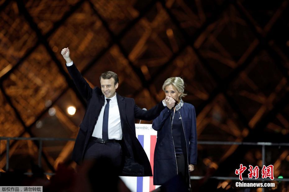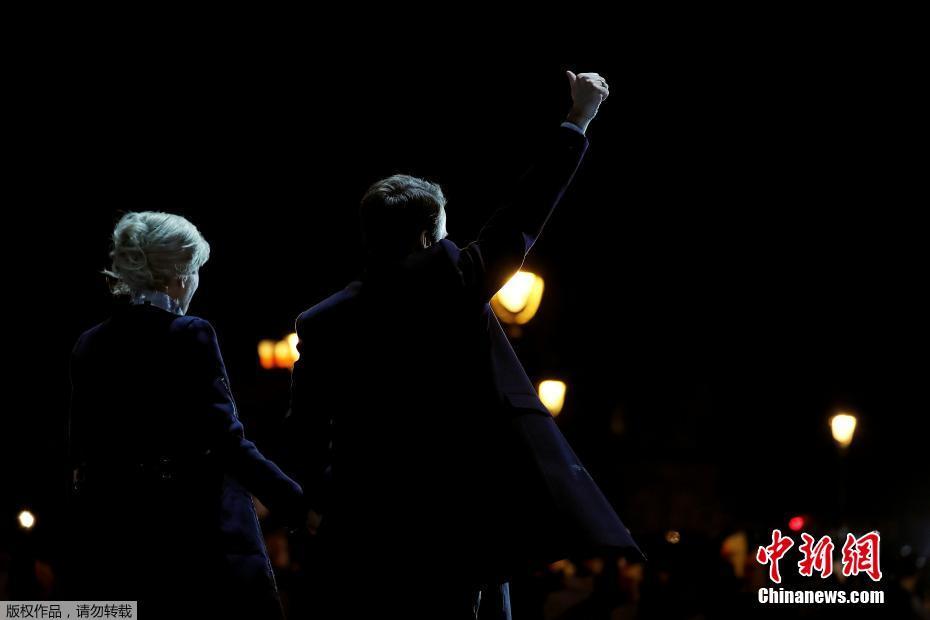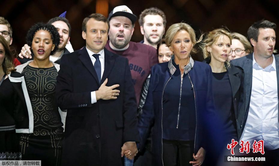 巴黎時間5月7日晚,法國總統選舉第二輪投票初步計票結果顯示,中間派獨立候選人、“前進”運動領導人埃馬紐埃爾·馬克龍以大幅優勢擊敗極右翼政黨“國民陣線”候選人馬麗娜·勒龐。年僅39歲的馬克龍由此成為法國史上最年輕的總統,也成為世界上最年輕的大國領導人。圖為馬克龍(左二)和妻子布麗吉特(右二)在慶祝勝選的集會上向支持者致意。中新社記者 龍劍武 攝