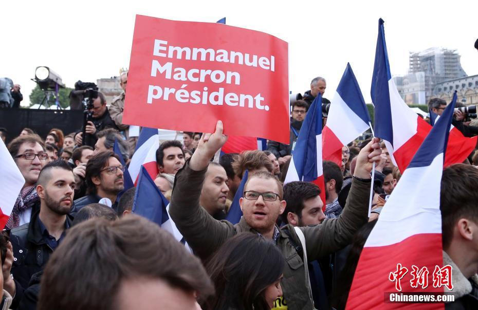 巴黎時間5月7日晚,法國總統選舉第二輪投票初步計票結果顯示,中間派獨立候選人、“前進”運動領導人埃馬紐埃爾·馬克龍以大幅優勢擊敗極右翼政黨“國民陣線”候選人馬麗娜·勒龐。年僅39歲的馬克龍由此成為法國史上最年輕的總統,也成為世界上最年輕的大國領導人。圖為馬克龍的支持者在得知馬克龍當選后歡呼。中新社記者 龍劍武 攝
