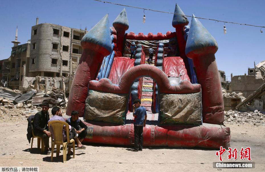 當地時間2017年6月26日,敘利亞反對派控制區杜馬,兒童在充氣城堡里玩耍慶祝開齋節。